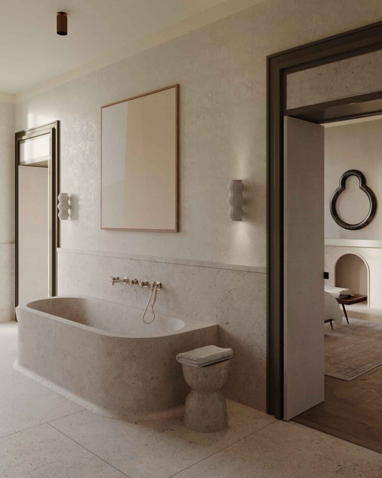 The south-facing aspect affords unimpeded views of the Alps. Measuring 42 square metres, with traditional Alpine woods, warm fireplaces, and natural-stone touches.